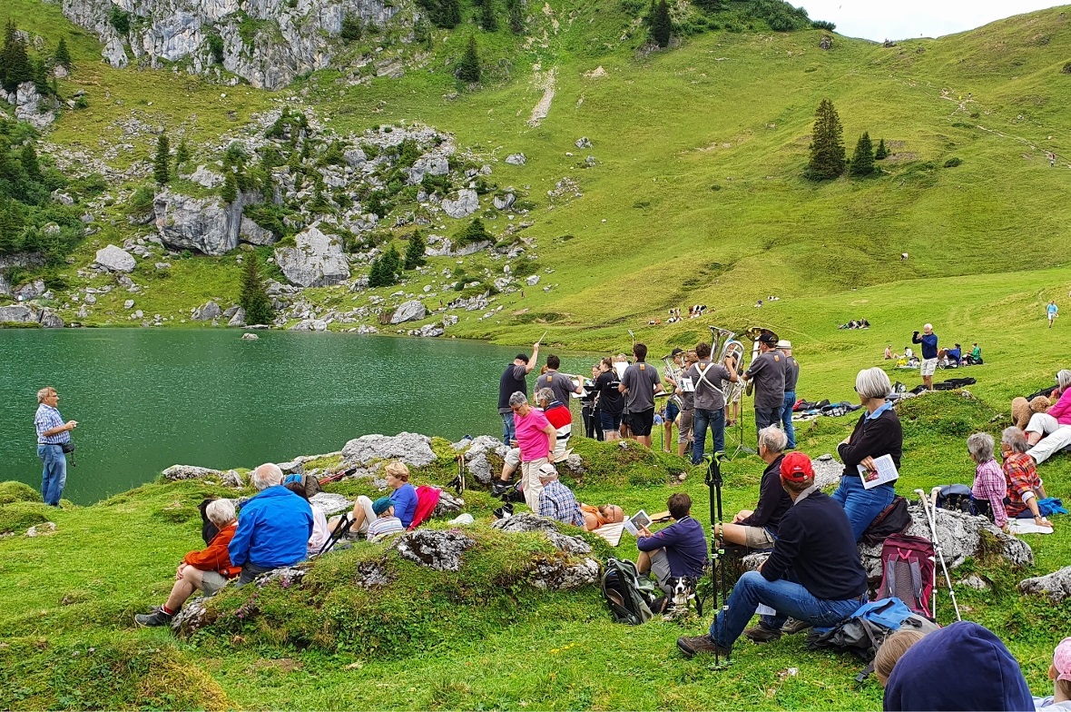 An dieser Stelle ein herzliches Dankeschön an Familie Abbühl, die uns bei der Vorbereitung des Gottesdienstes kräftig unterstützt hat, der Zweisimmer Musikgesellschaft unter der Leitung von Hanspeter Janzi, die eine stimmungsvolle musikalische Begleitung boten, der Familie Wampfler von der Firma Erich Schnidrig, die mit dem Predigttaxi dafür sorgte, dass auch ältere Gottesdienstbesucherinnen zuverlässig zum Seebergsee gebracht wurden, wie auch all den freundlichen Helferinnen und Helfern, ohne die so eine Bergpredigt gar nicht möglich ist.