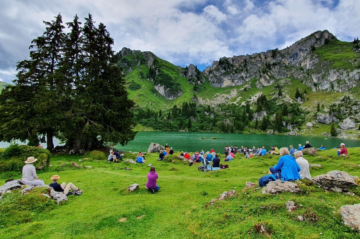 Eine stattliche Anzahl Besucher hatte sich auf der Mulde am Seeufer gelagert, dazu kam noch etwas «Laufkundschaft», die den Gottesdienst als angemessene Unterbrechung ihrer Wanderung betrachtete.