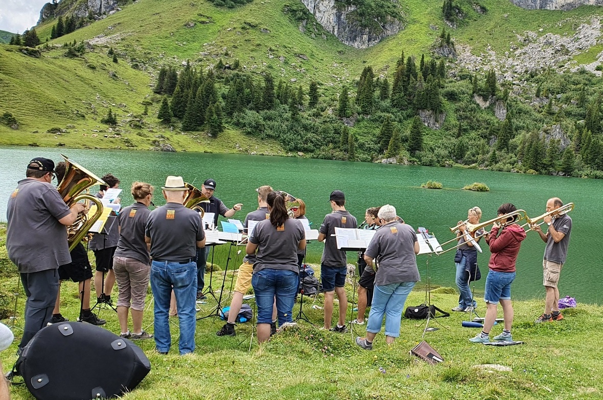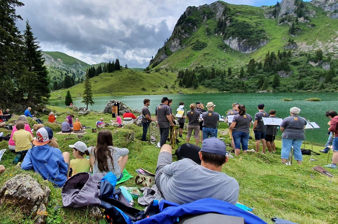 Doch die Zuversicht in die Verlässlichkeit der Wettervorhersage von SRF Meteo zahlte sich aus. Zur Mittagszeit herrschte am See wunderbares Wetter: Dramatische Wolken türmten sich auf, zwischendurch strahlte aber auch die Sonne durch immer grösser werdende Wolkenlücken. Es passte einfach alles, als pünktlich um 13 Uhr die Bläsergruppe der Zweisimmer Musikgesellschaft den Gottesdienst mit ihrem musikalischen Vorspiel eröffnete.