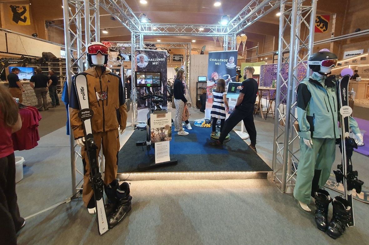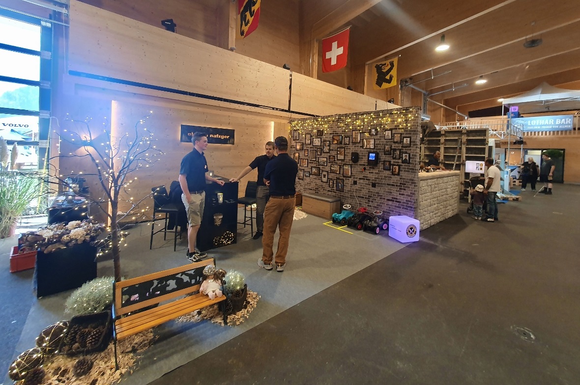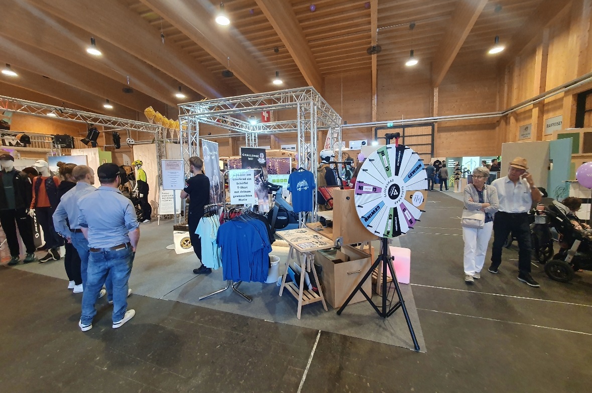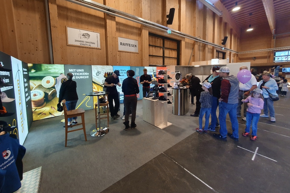 Politik- und Wirtschaftsvertretung am Stand von Tom Wittwer Sport. Von links: Kilian Wyssen, Präsident des Landesteilverbands Oberland-West der Berner KMU, Nationalrat Lars Guggisberg, Grossrätin Anne Speiser und Tom Wittwer.