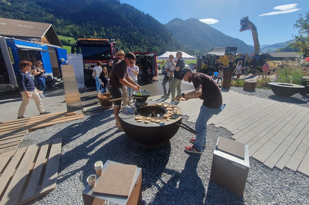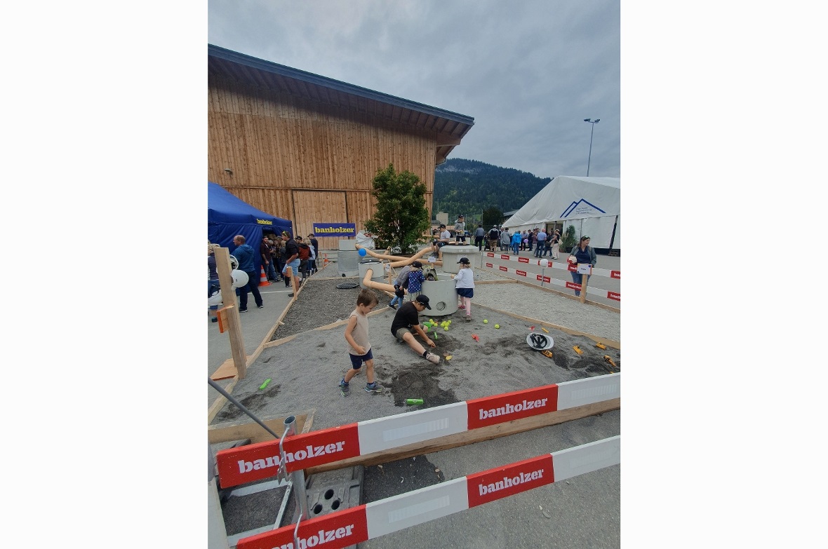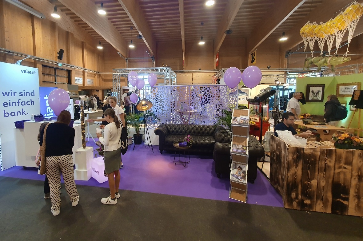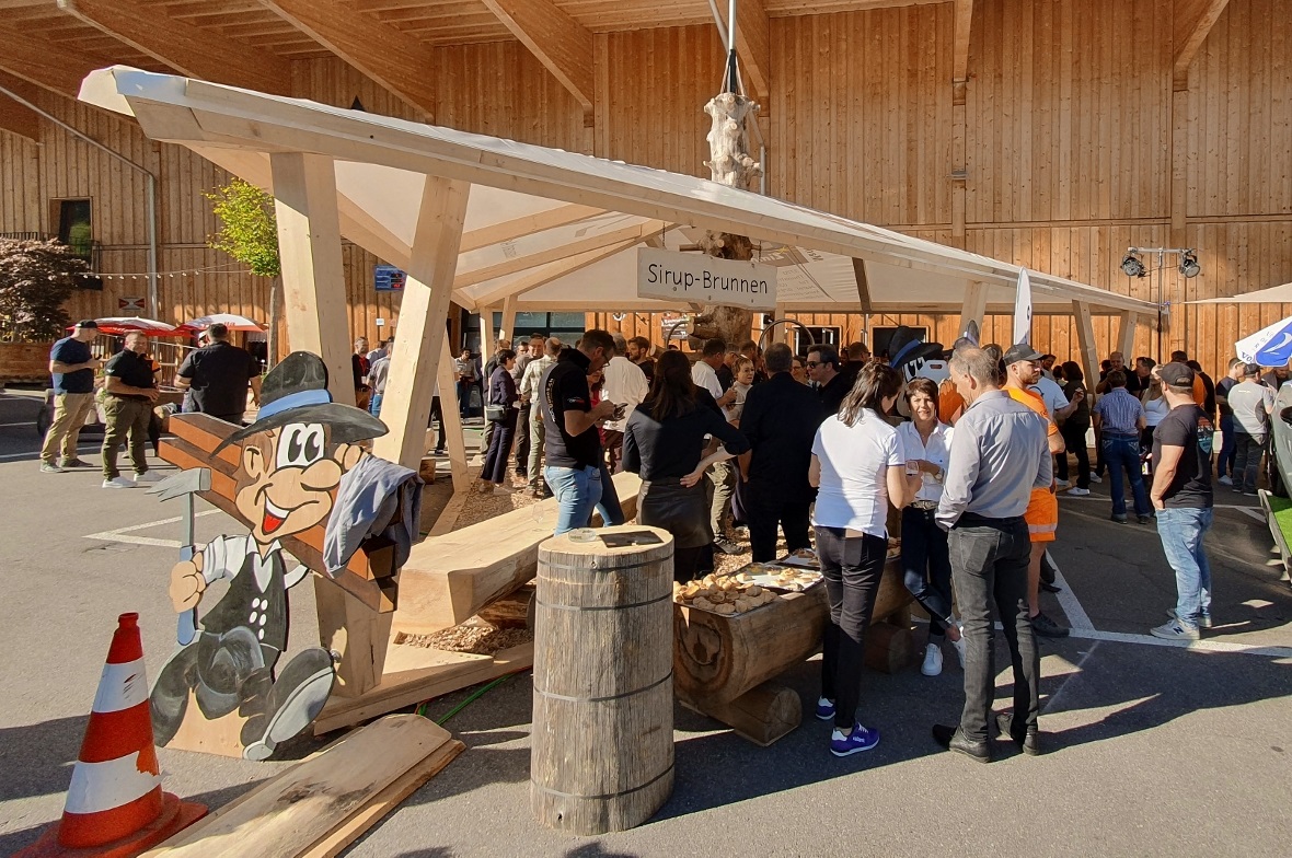 Politik- und Wirtschaftsvertretung am Stand von Tom Wittwer Sport. Von links: Kilian Wyssen, Präsident des Landesteilverbands Oberland-West der Berner KMU, Nationalrat Lars Guggisberg, Grossrätin Anne Speiser und Tom Wittwer.