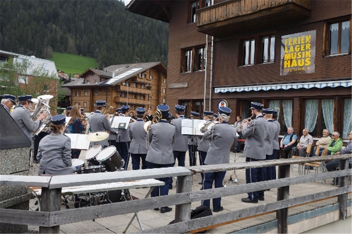 Am Samstagnachmittag, 5. Mai begrüsste die Musikgesellschaft Zweisimmen ihre Gäste mit einem halbstündigen Konzert auf der Terrasse vor dem Ferienlager. Unter der Leitung von Dirigent Hanspeter Janzi spielten sie verschiedene Stücke, traditionelle und auch moderne wie Pippi Langstrumpf oder «Up in the Sky» von 77 Bombay Street. Zum Glück blieb es die ganze Zeit trocken. Der Regen setzte erst ein, als die Gäste sowieso ins Ferienheim wechselten, um dort die Übergabe des Hauses an die neuen Pächter zu feiern.