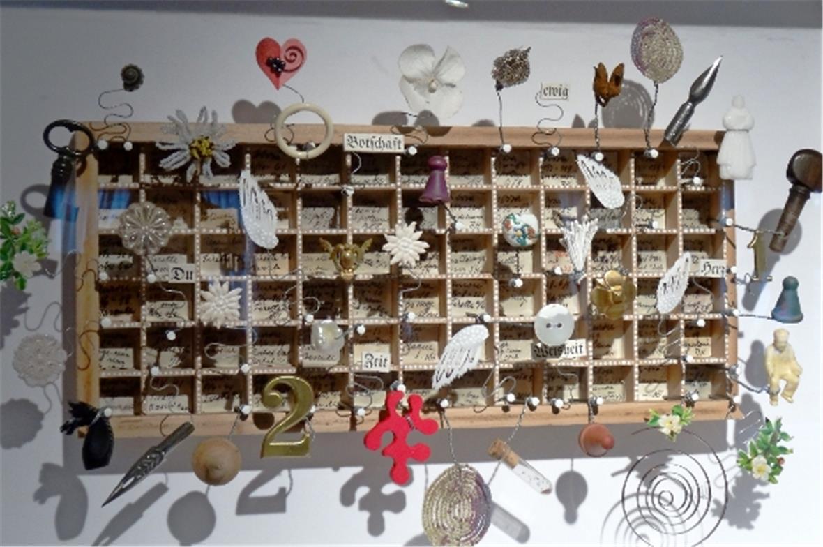 Es sind eben diese bewusst zusammengefügten vielen Dinge, die im Zusammenhang mit dem Titel und einzelnen aufgeklebten Worten immer wieder etwas anderes aussagen. Nehmen Sie sich Zeit, die Ausstellung zu besuchen und entdecken Sie die unerschöpfliche Phantasie und die vielen auf den ersten Blick nicht erkennbaren Kleinigkeiten und Details der Werke von Ueli Hofer.