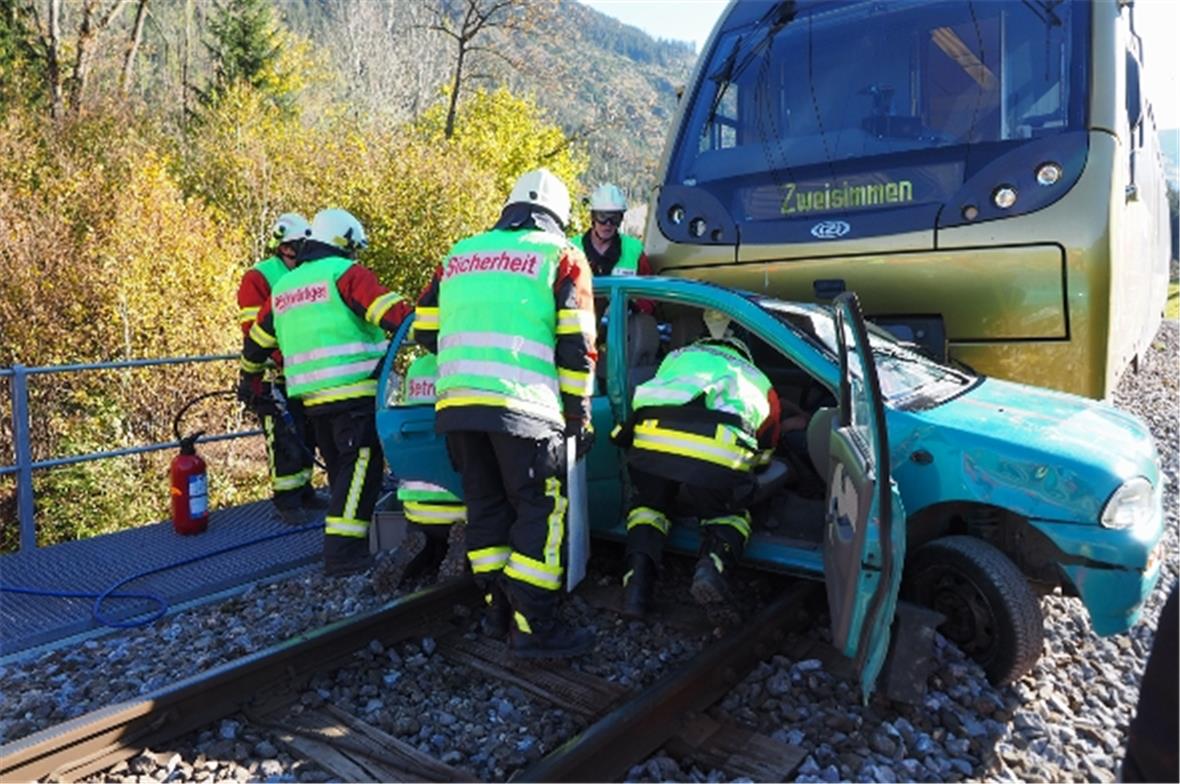 Die MOB probte zusammen mit der Feuerwehr Zweisimmen folgendes Unfall-Szenario: Ein Auto fuhr in Blankenburg vom Schloss in Richtung Simme über den Bahnübergang. Dabei wurde es von einem Zug erfasst und bis auf die Brücke mitgeschleift. Die Autoinsassen wurden verletzt und mussten von der Personenrettung Zweisimmen geborgen werden. Das Auto wurde beim Zusammenprall beschädigt und verlor Öl. Die Personen im Zug blieben unverletzt.