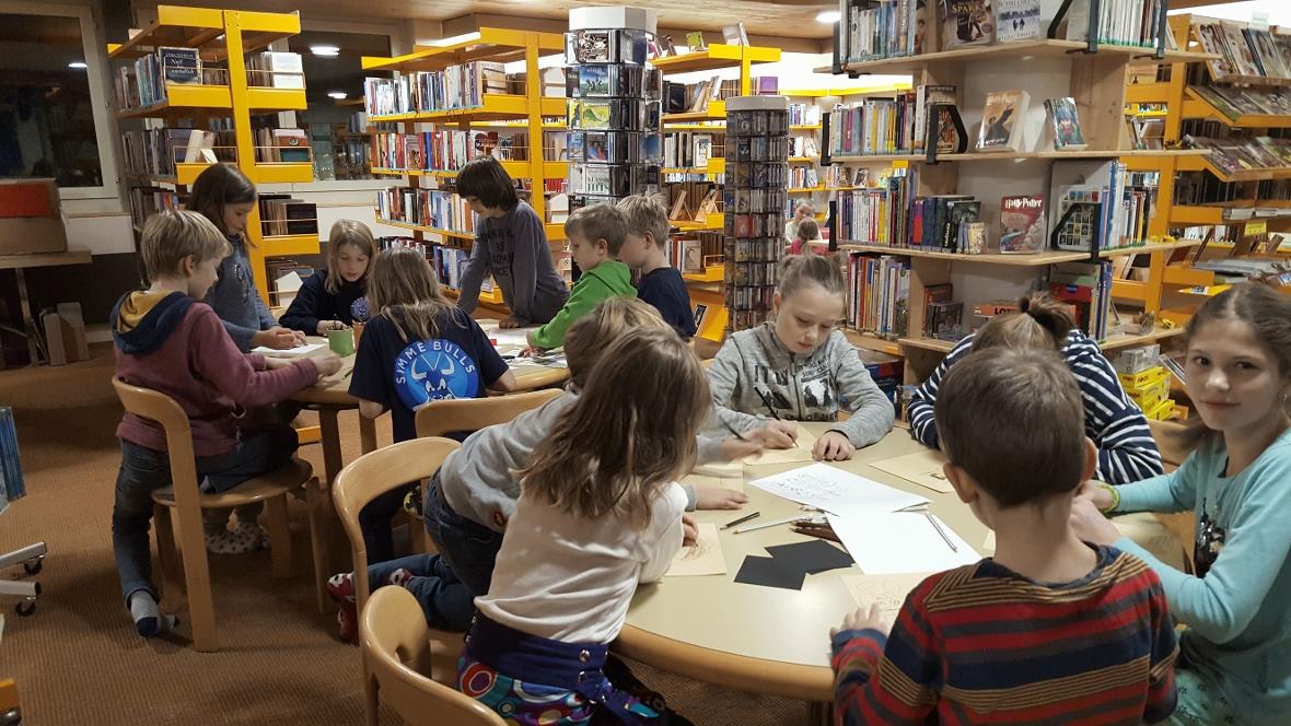 Gegen 19 Uhr trafen die ersten Kinder in der Bibliothek ein. Wie in jedem Jahr durften sie zu Beginn eine zum Thema passende Dekoration basteln, malen und ausschneiden. Bibliotheksmitarbeiterin Andrea Müller-Bach liess sich wieder eine besondere Idee einfallen. Die «blaue Bilderwand» über den Sitzstufen verwandelte sie in einen Wald und die Kinder ergänzten diesen mit farbig verzierten «Mut-Karten» und mit kleinen selbst erdachten Monstern, die sich nun hinter und zwischen den Bäumen tummeln.