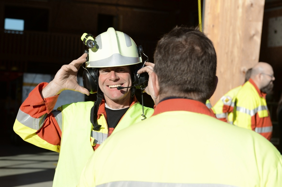 Für Peter Allemann begann die Schlussübung am vergangenen Samstag, 3. November 2018 ganz besonders: Vize-Kommandant Stefan Buchs und Kreisfeuerwehrinspektor Albrecht Müller holten Peter zu Hause ab und begleiteten ihn zur Helikopterbasis. Denn als Abschiedsgeschenk erhielt der abtretende Kommandant einen Rundflug über «sein» Einsatzgebiet. Sie flogen nochmals die wichtigsten Ereignisorte ab und begutachteten diese von oben. Nach dem Rundflug wurde Allemann vor dem Magazin abgesetzt und von seinen Feuerwehrkameraden in Empfang genommen.