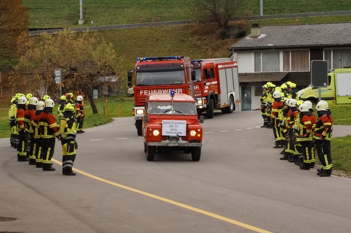 Anlässlich der Verabschiedung und zur Ehrung des langjährigen Vizekommandanten Stefan Buchs wurde zum Übungsstart mit allen Feuerwehrfahrzeugen eine Parade durch das Dorf Zweisimmen gefahren. Vorbei ging es an den verschiedenen Einsatzorten in der Vergangenheit bis zum neuen Feuerwehrmagazin in der Simmental Arena. Dort wurde die Parade von der Mannschaft mit einem Spalier empfangen. Eingekleidet in einer alten Feuerwehr-Uniform fuhr Stefan Buchs im alten Land Rover des Feuerwehrvereins Zweisimmen beim Magazin ein.
