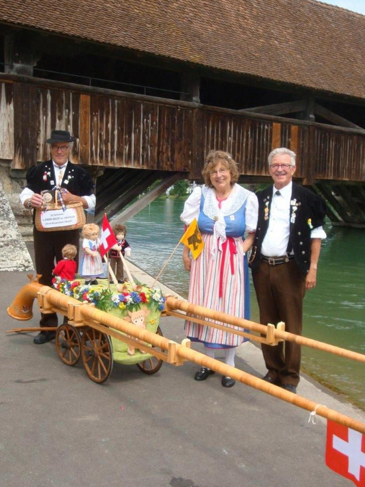 Die Alphornbläser Walter Arm, Vreni Hiltebrand und Hansruedi König haben nicht nur Alphornklänge ans Jodlerfest gebracht. Sie haben sogar ein wunderschönes musikalisches Umzugsbild gestaltet mit dem dekorierten Leiterwagen und Vrenis Alpfest-Drehorgel.
